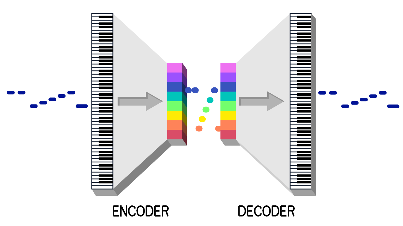 We wouldn’t consider every possible combination of piano notes musical, just like not every random combination of letters is a sentence. Music has structure: it follows patterns, scales, motifs. When the encoder and decoder are trained, they learn how to compress music (that is, express it using a smaller amount of symbols) by finding the common structure and patterns in the examples we give them. They work with the musically interesting sequences and ignore the arbitrary ones.